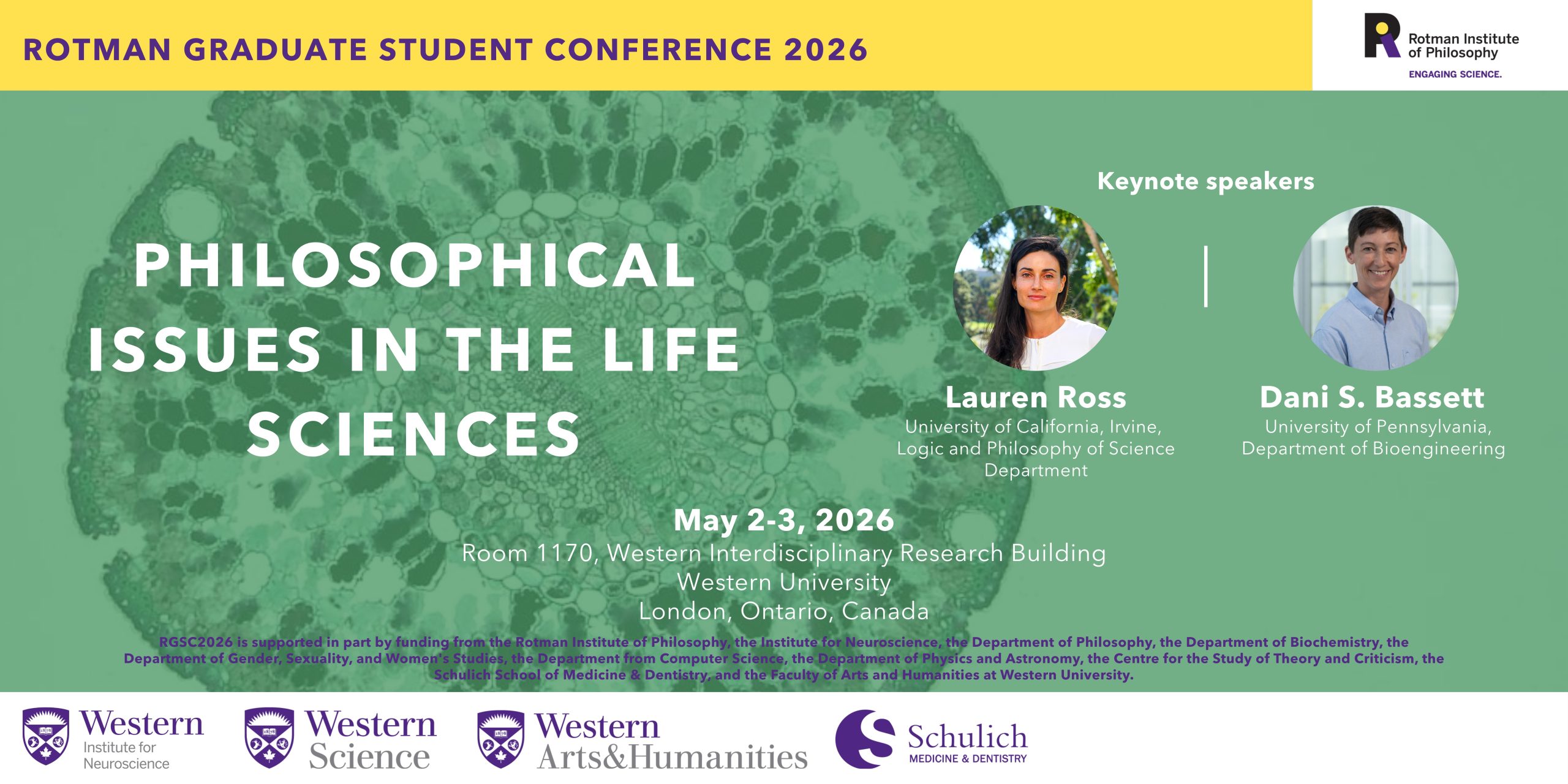 Room 1170 - Western Interdisciplinary Research Building Western Interdisciplinary Research Building, London, Ontario, CanadaThe Rotman Institute of Philosophy is excited to announce the second annual Rotman Graduate Student Conference, taking place on Saturday, May 2 and Sunday, May 3, 2026. We are pleased to announce Philosopher, Dr. Lauren Ross (University of California, Irvine) and Professor of Bioengineering, Dr. Dani S. Bassett (University of Pennsylvania) as our keynote [...]