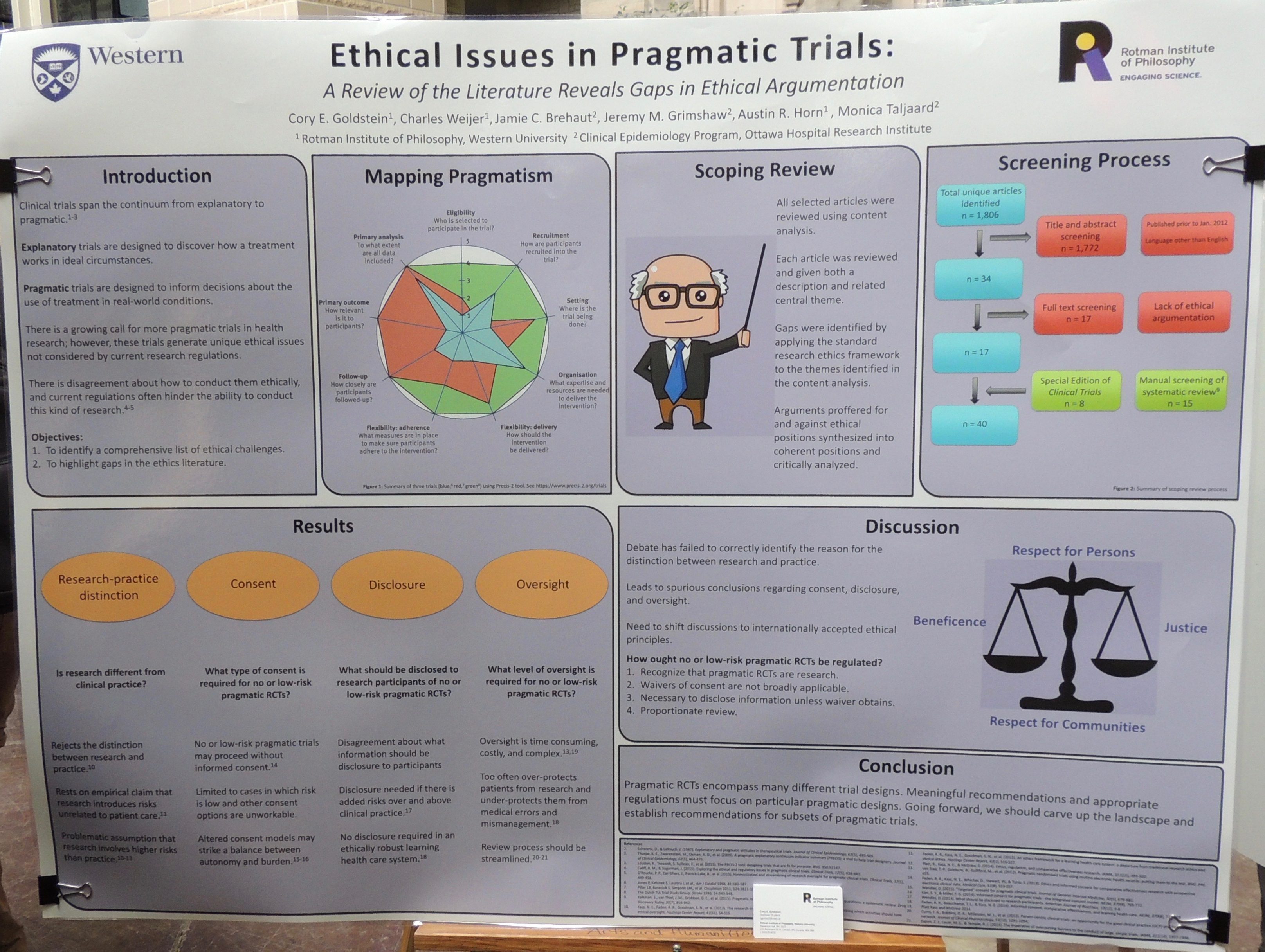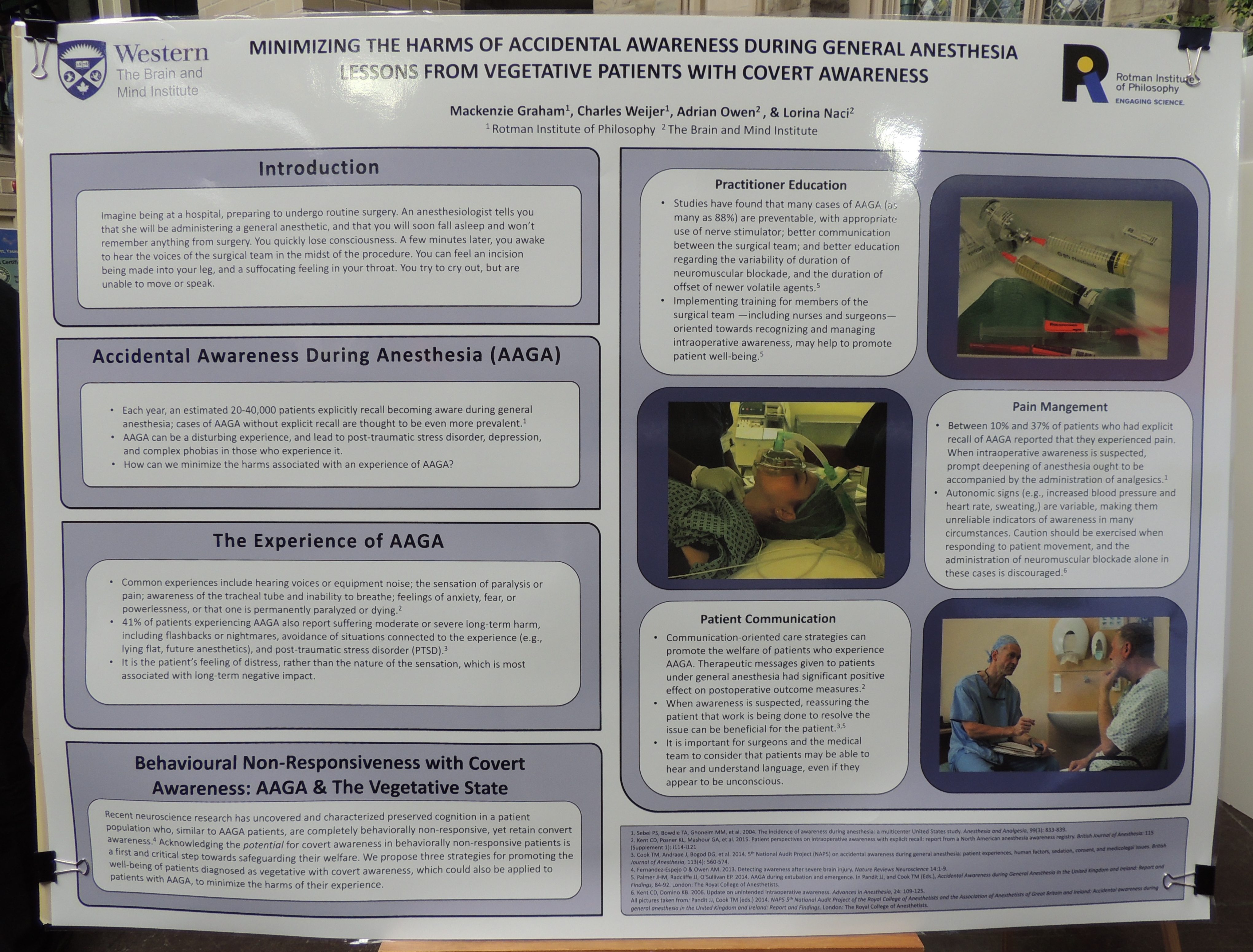 Five posters from the Rotman Institute were presented at the Arts & Humanities Research Day event, held on February 28. The posters are shown below (left to right): Rotman Postodctoral Fellows (created by Lucas Dunlap); Minimizing the Harms of Accidental Awareness During General Anesthesia: Lessons from Vegetative Patients with Covert Awareness by Mackenzie Graham; Ethical Issues in Pragmatic Trials by Cory Goldstein; Engaging Pain Philosophically by Kyoko Wada; and Einstein @ Rotman presented by the Rotman Institute.